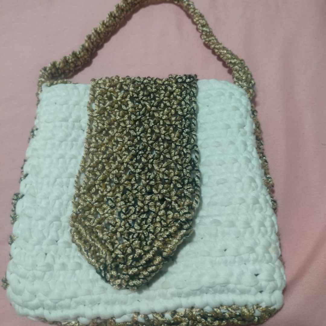This is a handmade crochet mobile bag made using soft and durable T-shirt yarn. Featuring a neat color-block design and a comfortable handle, it is lightweight, reusable, and perfect for carrying a mobile phone and small essentials while adding a simple handmade charm to your everyday look.